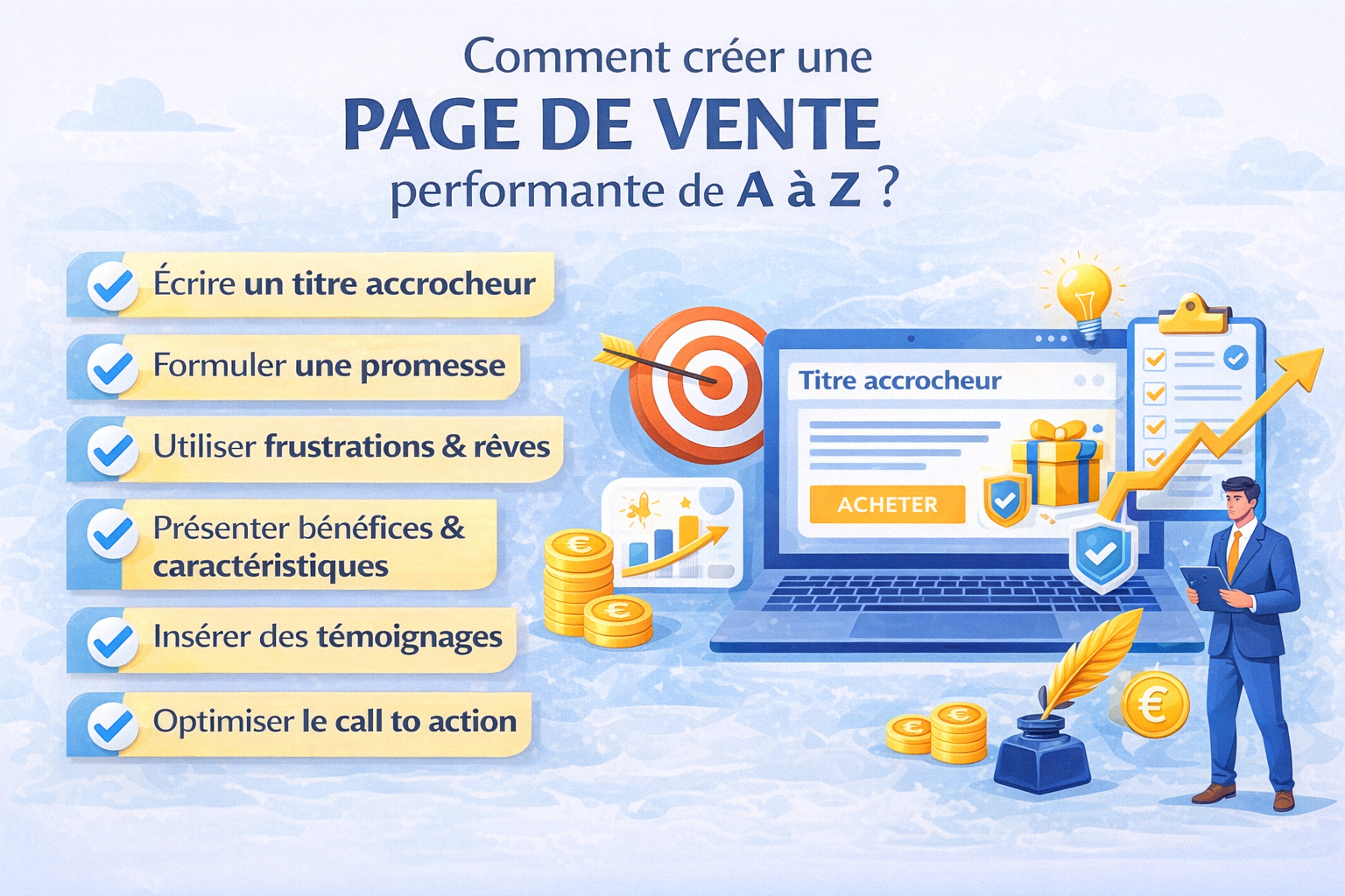 Créer une page de vente performante est un enjeu stratégique majeur pour tout entrepreneur souhaitant transformer son trafic en clients qualifiés. Une page de vente efficace ne repose pas uniquement sur un design attractif, mais sur une structure claire, un copywriting persuasif et une compréhension approfondie du client cible. De l’accroche à l’appel à l’action, chaque élément doit guider le lecteur dans un tunnel de conversion optimisé afin d’augmenter le taux de conversion et le chiffre d’affaires. Dans un environnement digital concurrentiel, savoir structurer et rédiger une page de vente de A à Z permet de se différencier, de renforcer sa crédibilité et de maximiser l’impact de son marketing digital. Dans cet article, nous verrons les étapes essentielles pour construire une page de vente stratégique, convaincante et orientée résultats.